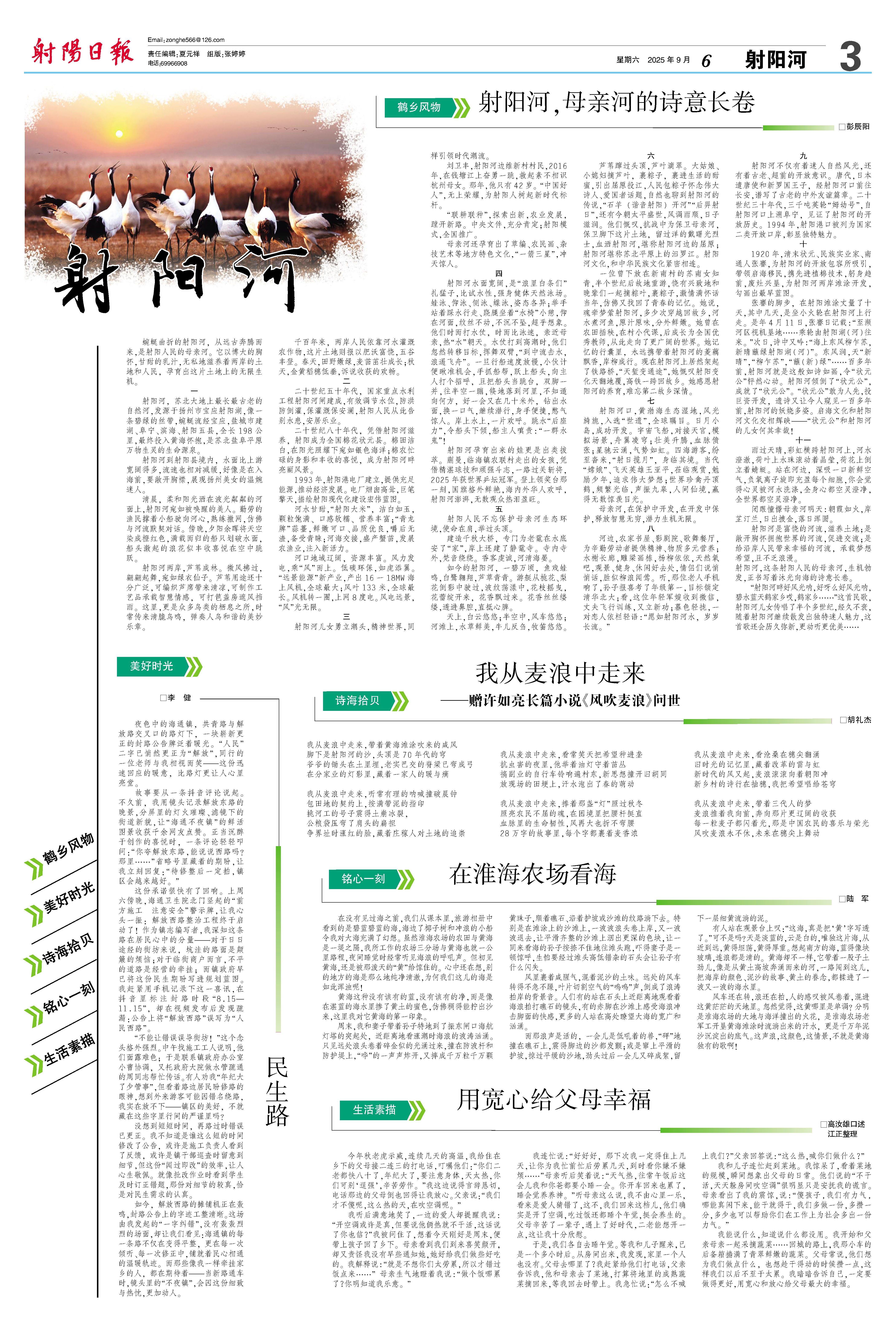 “射阳河畔好风光呐,好呀么好风光呐,碧水蓝天鹤家乡哎,鹤家乡……”这首民歌,射阳河儿女传唱了半个多世纪,经久不衰,随着射阳河继续散发出独特迷人魅力,这首歌还会历久弥新,更动听更优美……